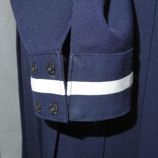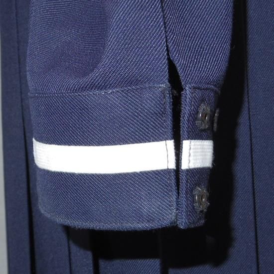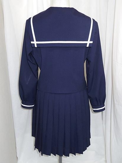 セーラー上:ネームタグにネーム記入あり、襟右校章等痕穴1(画像6枚目)、胸ポケット若干名札痕、両袖口擦れと白線汚れ、襟ぐり胸当て上辺両袖口汚れ、両肘から下若干テカり。