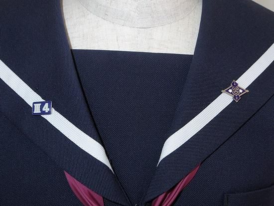 紺色冬セーラー上下に校章・組章・指定リボンが付きます。