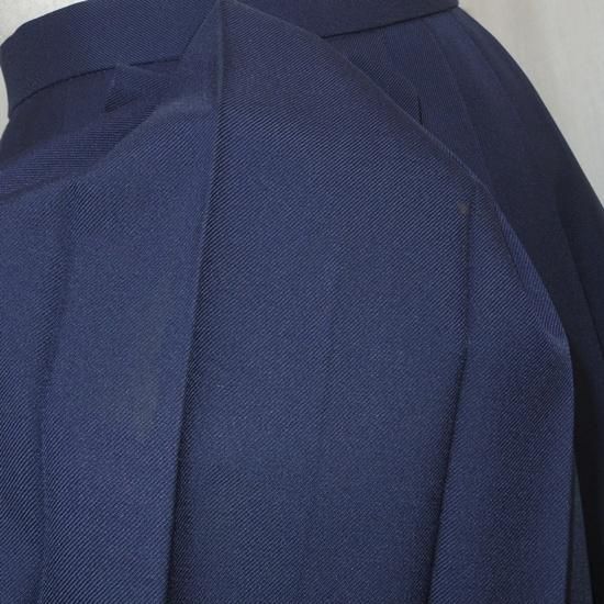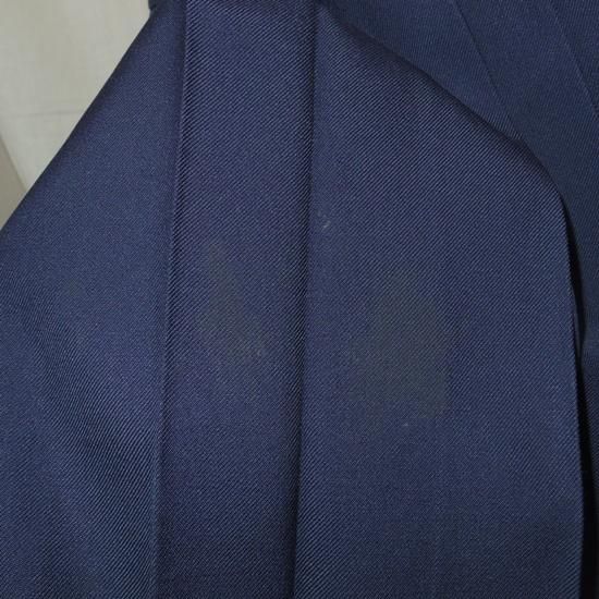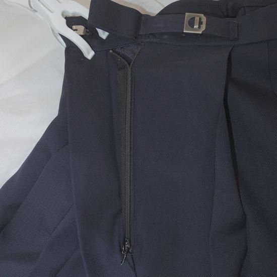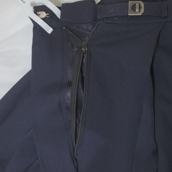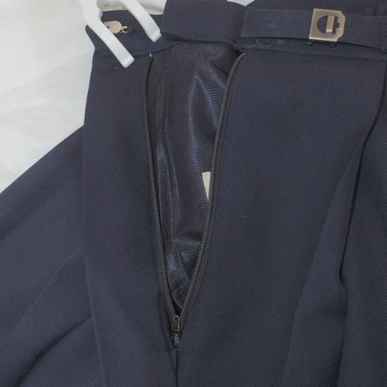 ファスナーが上下逆(画像3〜5枚目)、前茶汚れ多数(画像6〜7枚目)、プリーツ所々二重線と擦れ、後ろテカり。