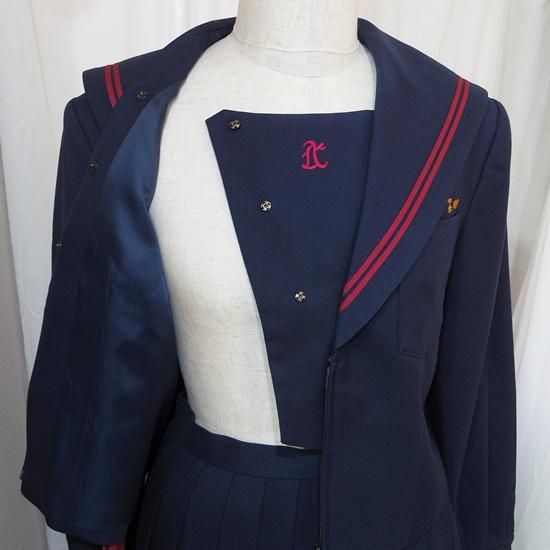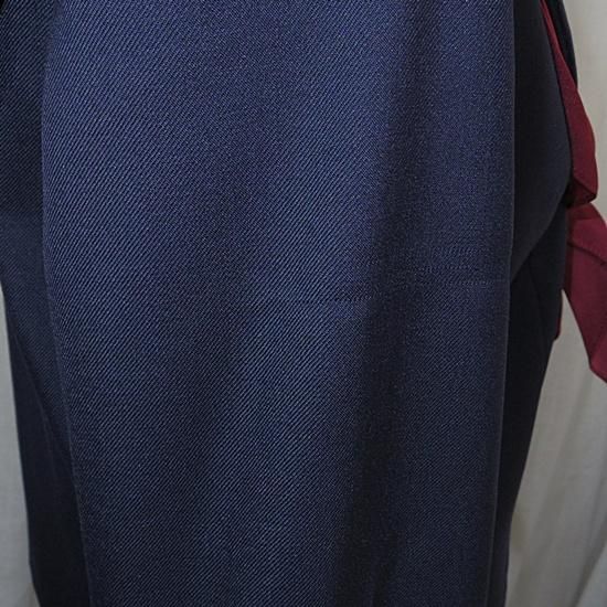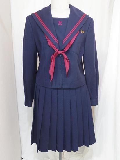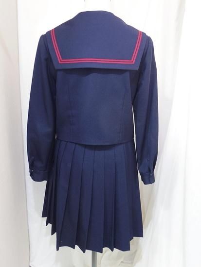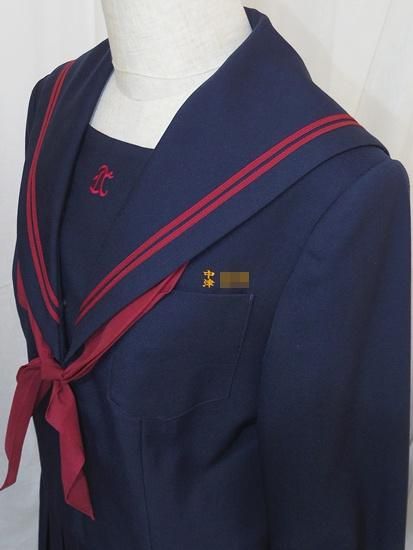 紺色冬セーラー服上下にリボンスカーフ(スナップ着脱、指定品か不明)が付きます。