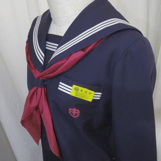 紺色冬セーラー服上下に樹脂製のネームプレートと中古スカーフ(指定品か不明)が付きます。