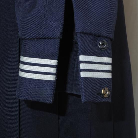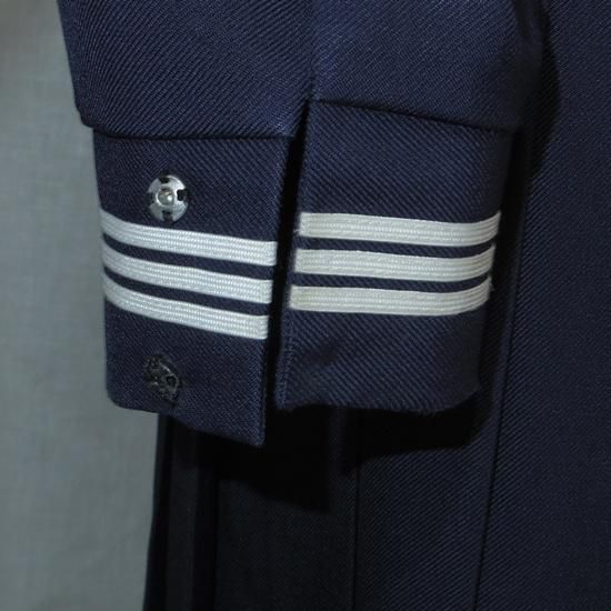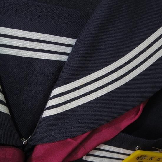 セーラー上:襟後ろ下内側にネーム刺繍あり、左襟元白線茶汚れ(画像6枚目)、胸ポケット口章跡穴(画像7枚目)、両袖口擦れと汚れ(画像8〜9枚目)、両肘から下若干テカり。